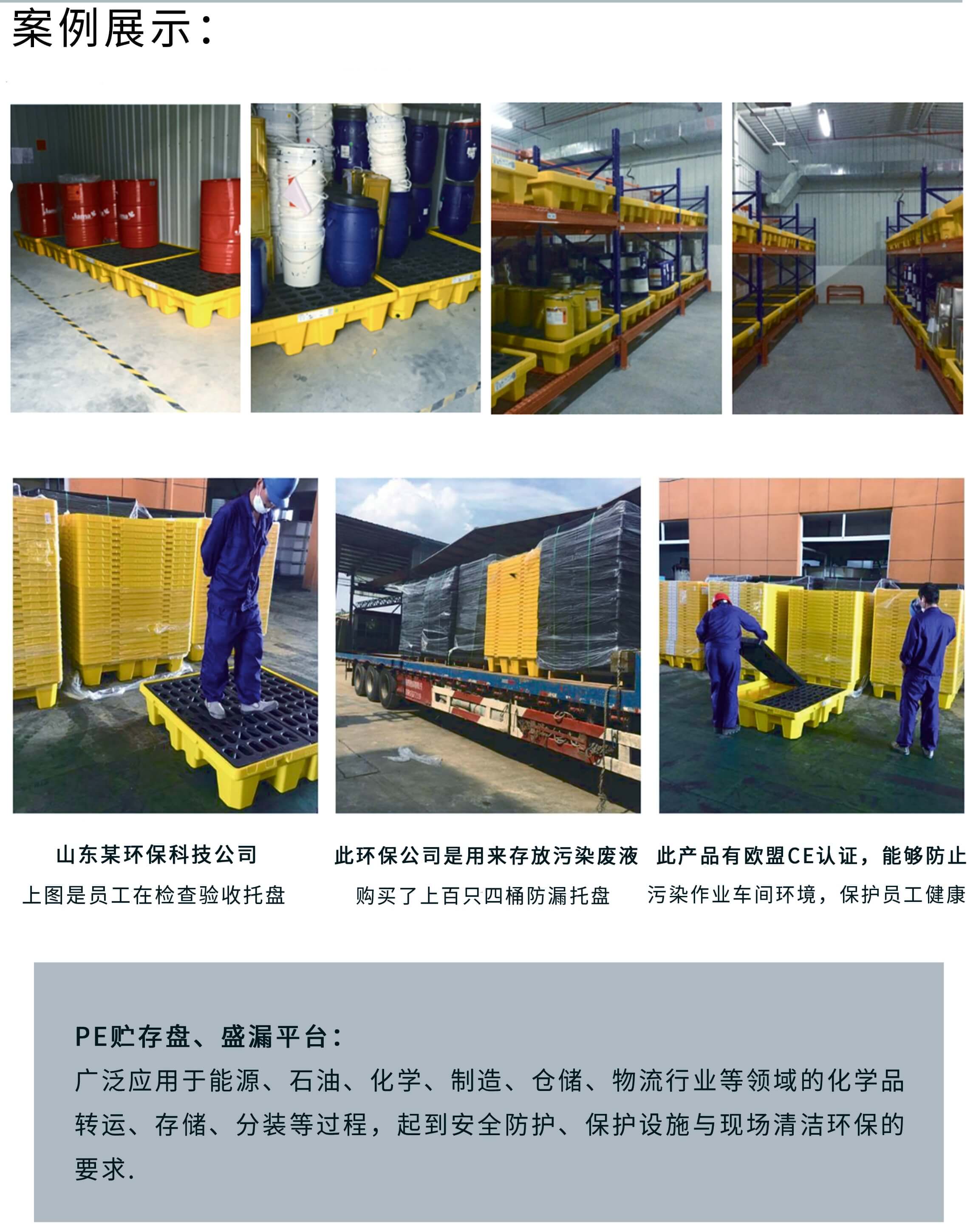 選擇使用防滲漏塑料托盤的目的是為了防止油品,化學品和危險液態品在存儲以及分裝的過程中發生的泄漏而造成操作人員的人身傷害以及泄漏造成的環境污染。通過使用這種能盛裝泄漏出來的液體的托盤,得到一個干凈、衛生、安全的工作環境,不僅保護操作人安全,還能有效的防止環境污染,符合環保要求。